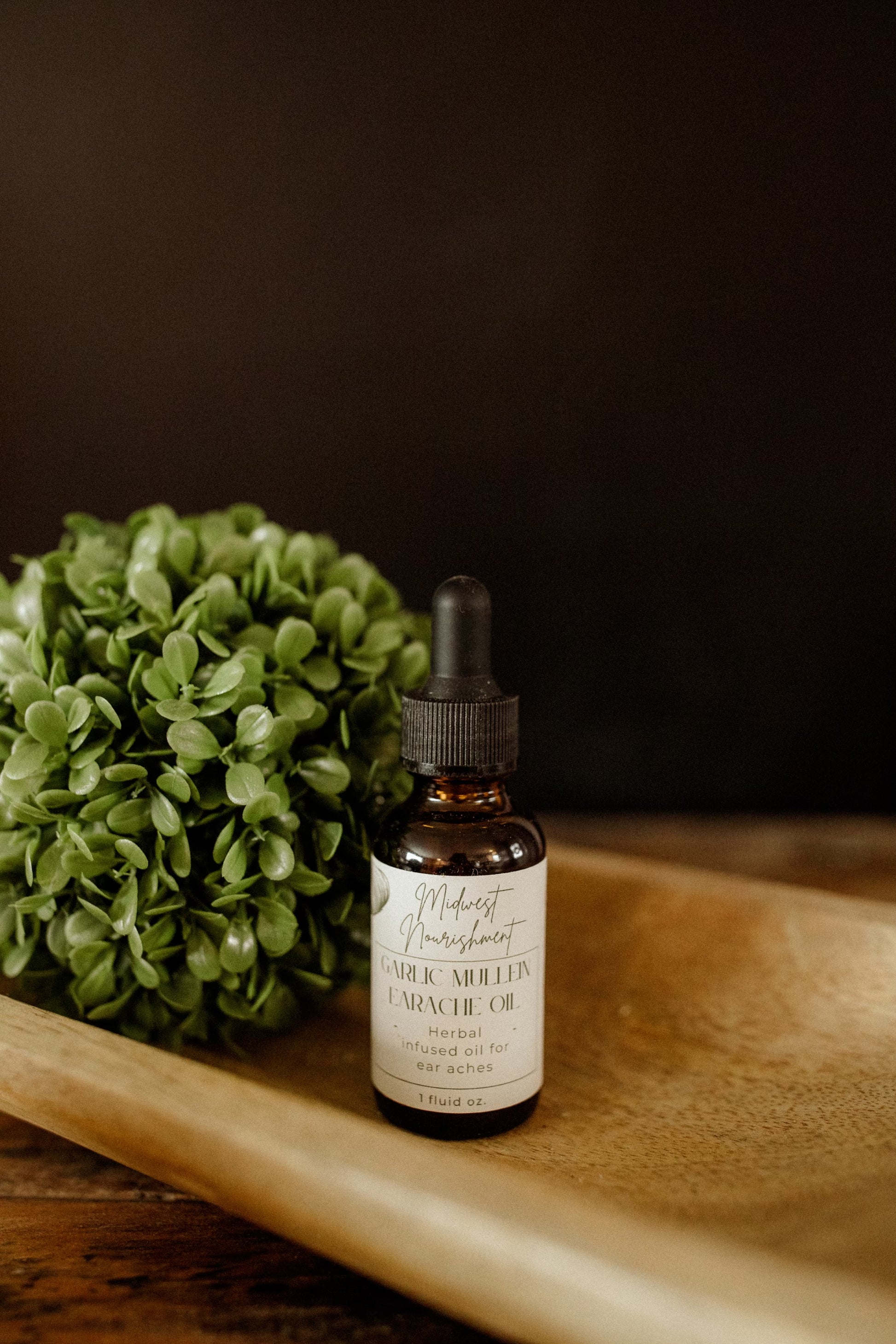 Dried, wildcrafted mullein leaves pair with organic dried garlic cloves (grown in my own garden!) and are infused into organic olive oil to help soothe earaches. Garlic mullein infused oil has antiviral and antibacterial properties to help combat ear infections and can be a powerful remedy to have on hand for when those 2am ear aches strike!
