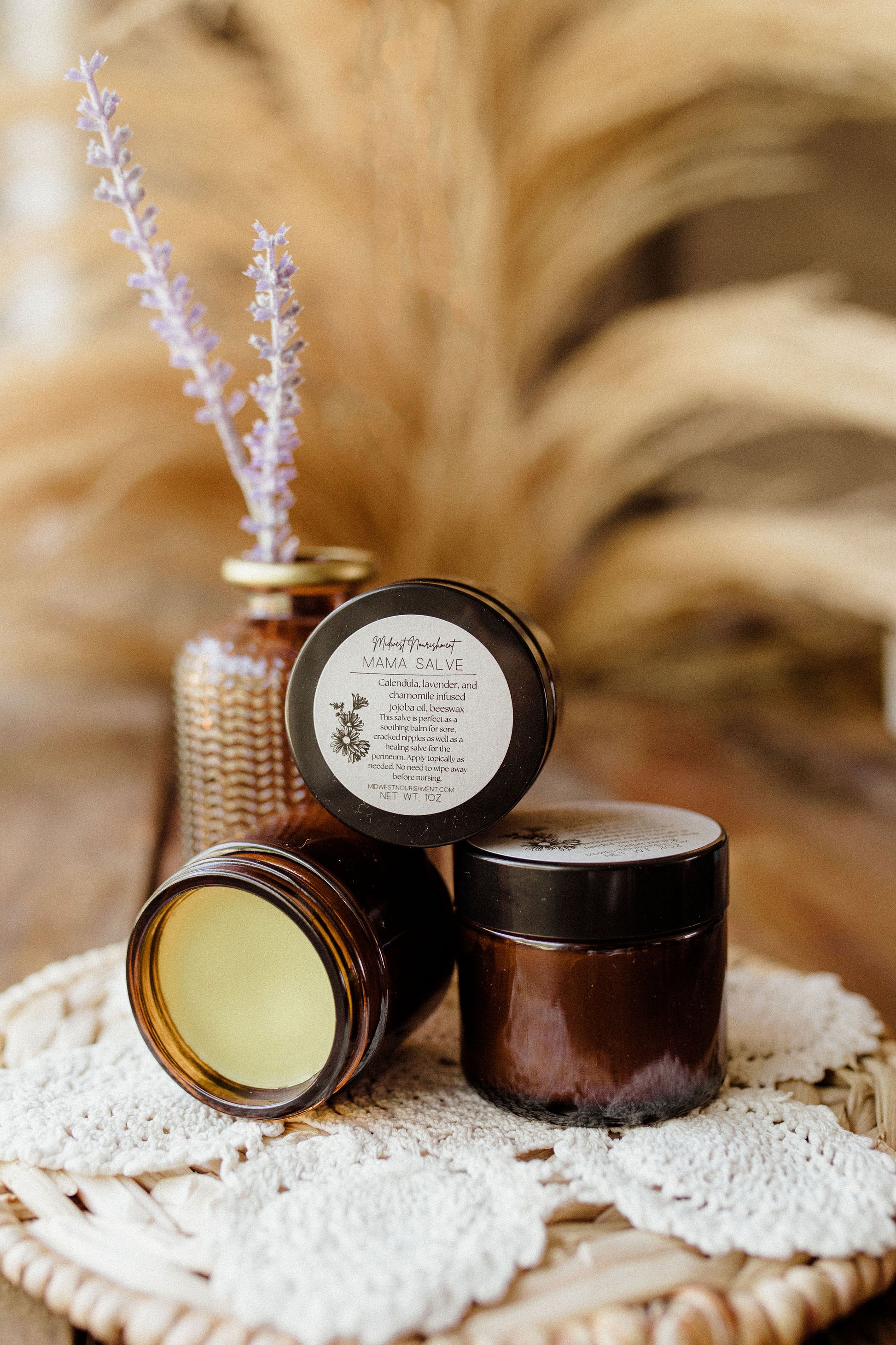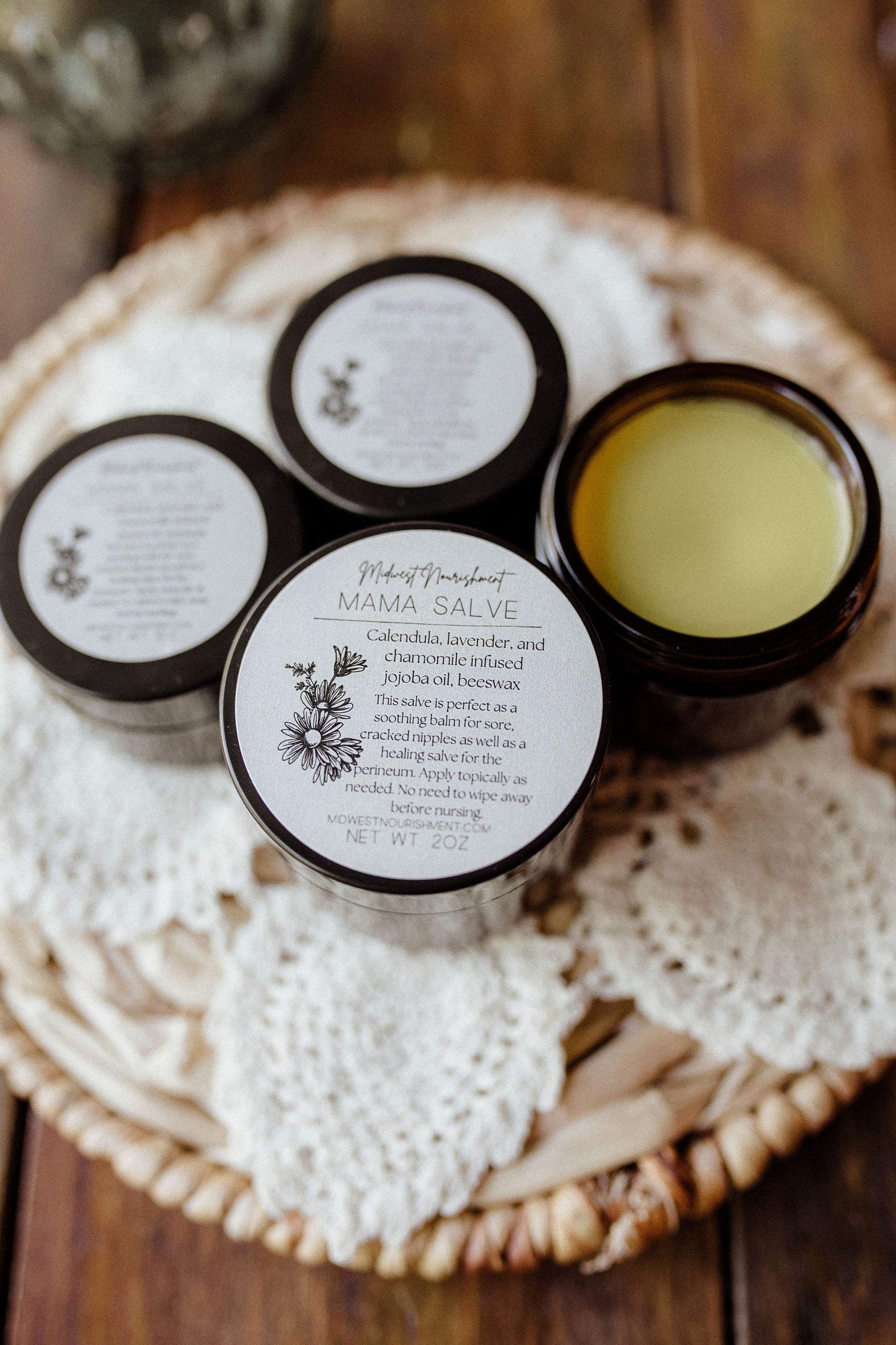 Mama Salve is a dream for sore/cracked nipples! You can use this as a soothing nipple butter before or after nursing, and it doesn't need to be wiped away. It can also be used as a healing perineal salve for after-birth, or as pump flange lubricant for pumping mamas! This product uses NO essential oils.