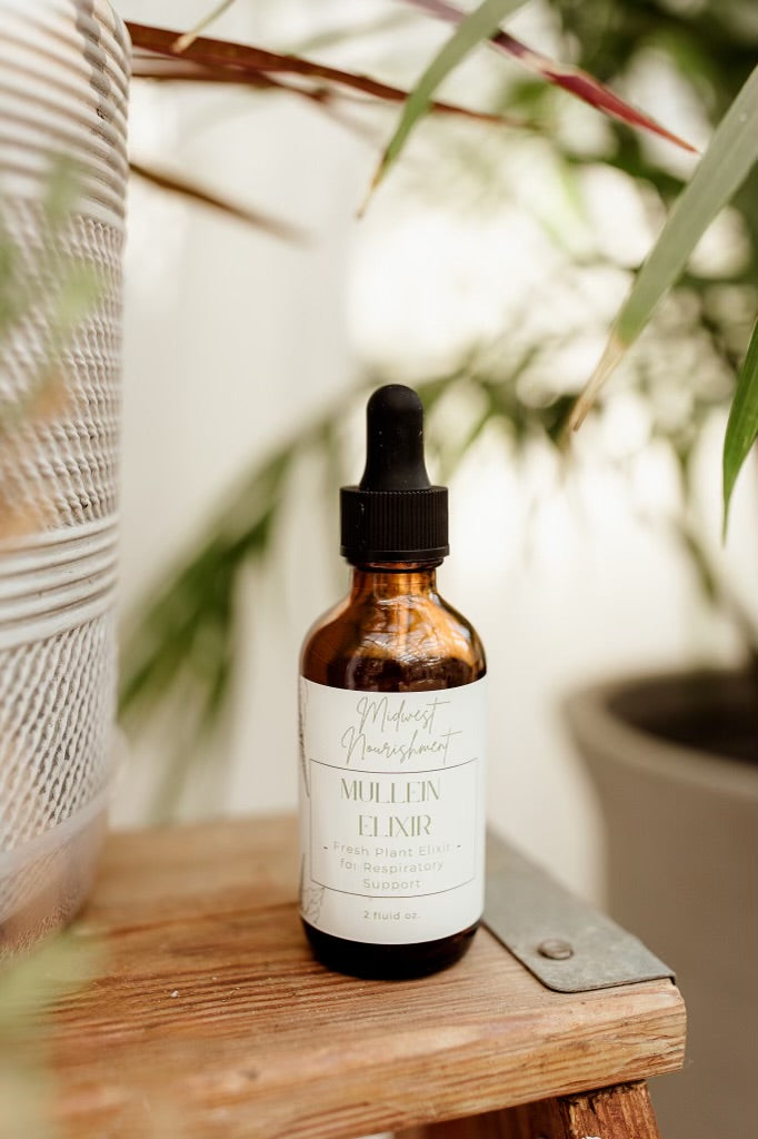 Fresh Mullein elixir is your friend for lung support. This powerful herb can help loosen mucus, and acts as an expectorant. Before the development of antibiotics, mullein was used for whooping cough, tuberculosis, and pneumonia. Mullein gently coats the mucus membranes and reduces inflammation in the airways.
