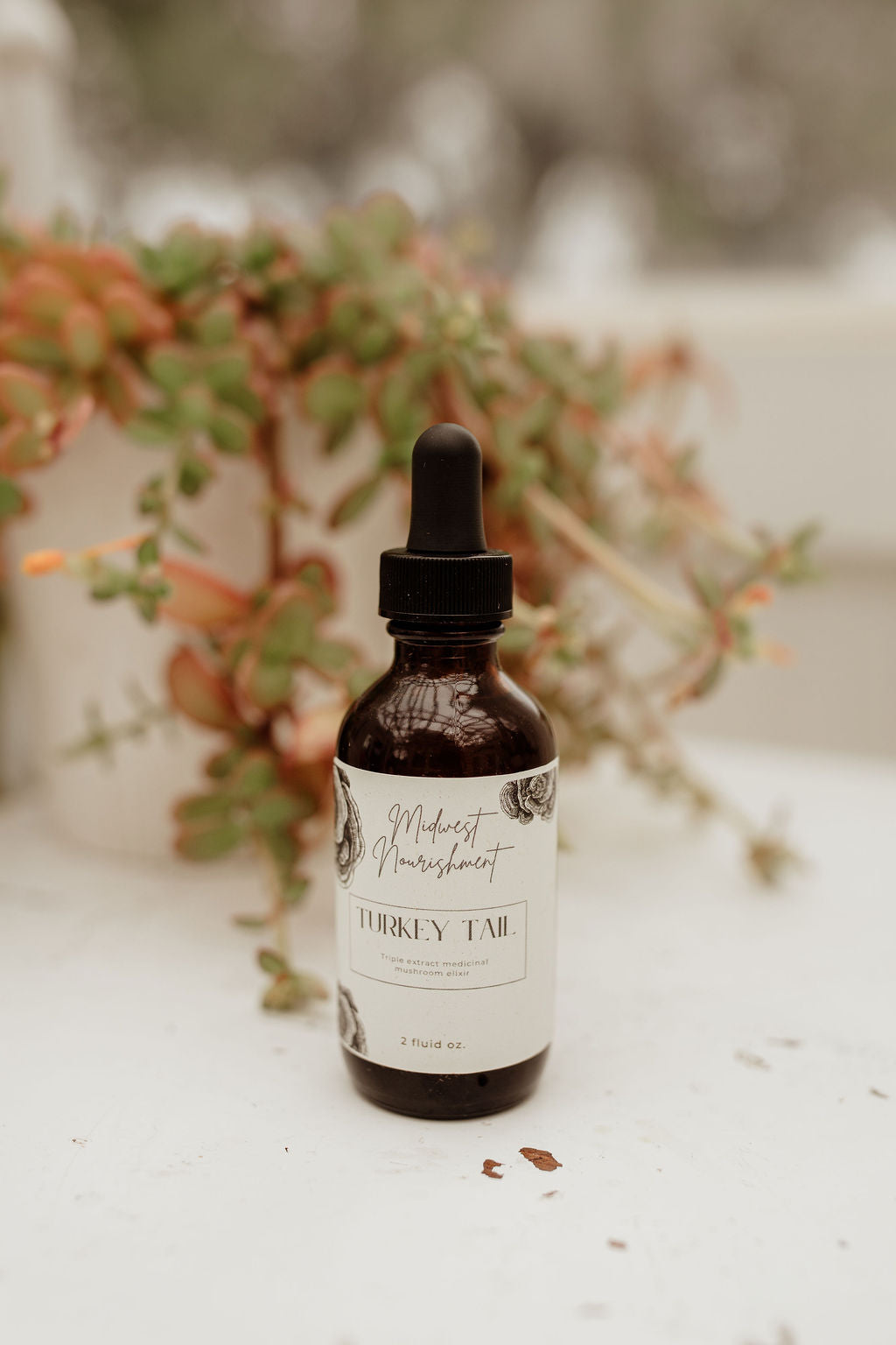 Ingredients: Wildcrafted turkey tail mushroom, 190 proof alcohol, non-GMO palm derived glycerin, raw local honey, reverse osmosis water
